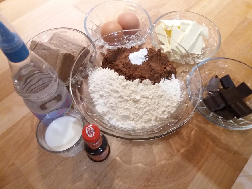 Amíg előkészítettem-kimértem a hozzávalókat, addig a gesztenyepürét meleg helyre tettem, hogy puhára olvadjon. A lisztet összekevertem a kakaóporral és a sütőporral. Egy másik tálban robotgéppel összedolgoztam a margarint, tojást, édesítőt és a gesztenyét, ízesítettem egy kevés rumaromával, majd belekevertem a tejet is. Ezután kanalanként adtam hozzá a lisztes-kakaós keveréket.