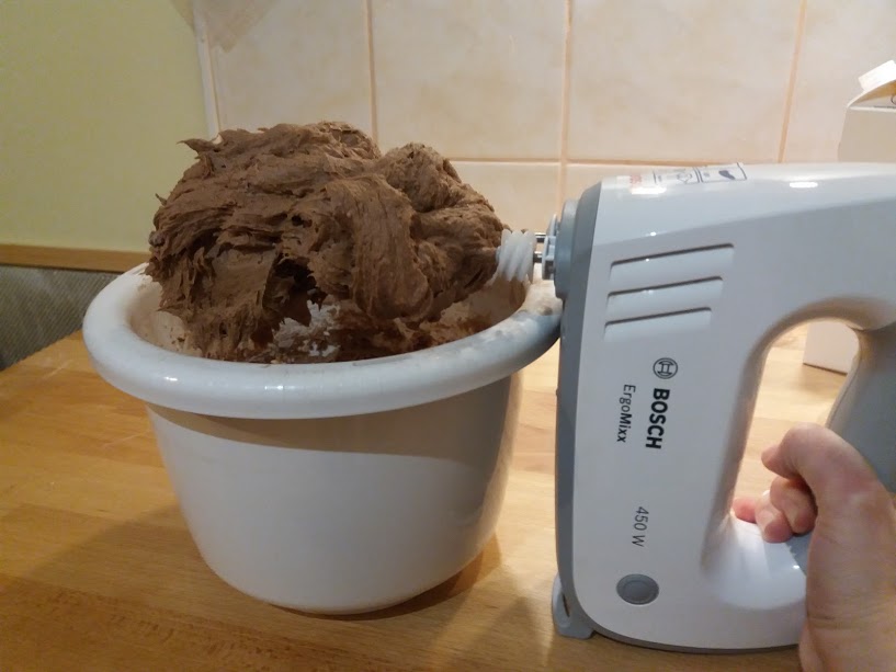 Végül adtam hozzá még tejet (így lett összesen kb. 2,5 dl benne), és ezután már szép egyenletes masszává lehetett keverni. Már csak az apró darabokra vágott étcsokit kellett hozzátenni, és kész is!
