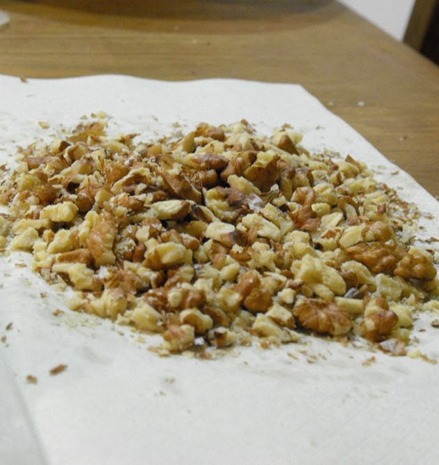 A datolyát éles késsel apró darabokra vágjuk. A diót szintén felaprítjuk. Ez megtehetjük úgy is, hogy két réteg szalvéta vagy papírtörlő között nyújtófával alaposan összetörjük-préseljük. Nem kell nagyon apróra darálni!