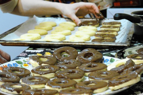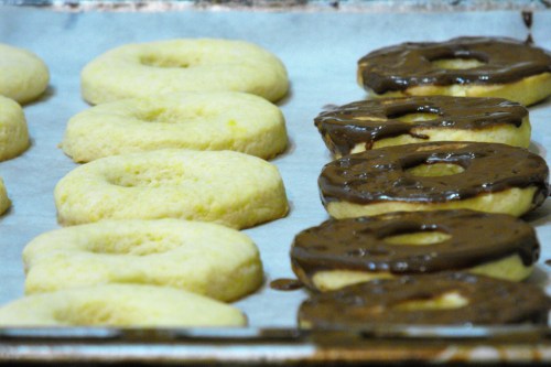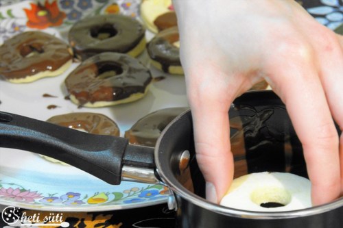 Ezután következett a mártogatás 🙂 Én bizony nem sajnáltam a csokit, alaposan megmártóztattam benne a karikák alját, majd visszatettem a tepsibe száradni, a mázas felével felfelé.