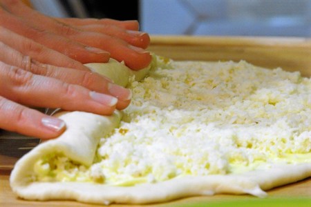 Kb. fél centi vékonyra, téglalap alakúra nyújtottam. Megkentem a margarinnal és jó bőven megszórtam reszelt sajttal.