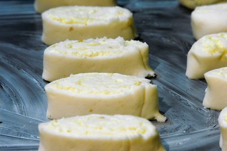Ezután a hosszabbik oldalán fogva szorosan feltekertem. Néhányszor meghengergettem, hogy összeálljon a formája, majd egy éles késsel 2-3 centi vastag szeletekre vágtam.