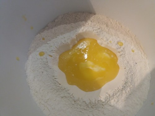 A tojás elhabartam a tejjel, majd ezt a keveréket és az olvasztott margarint is a liszthez öntöttem.