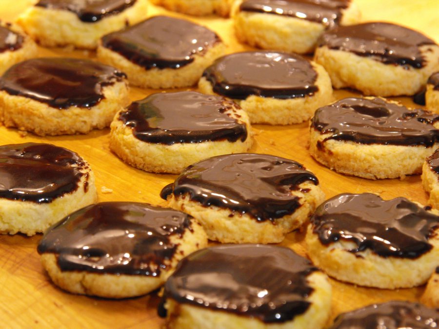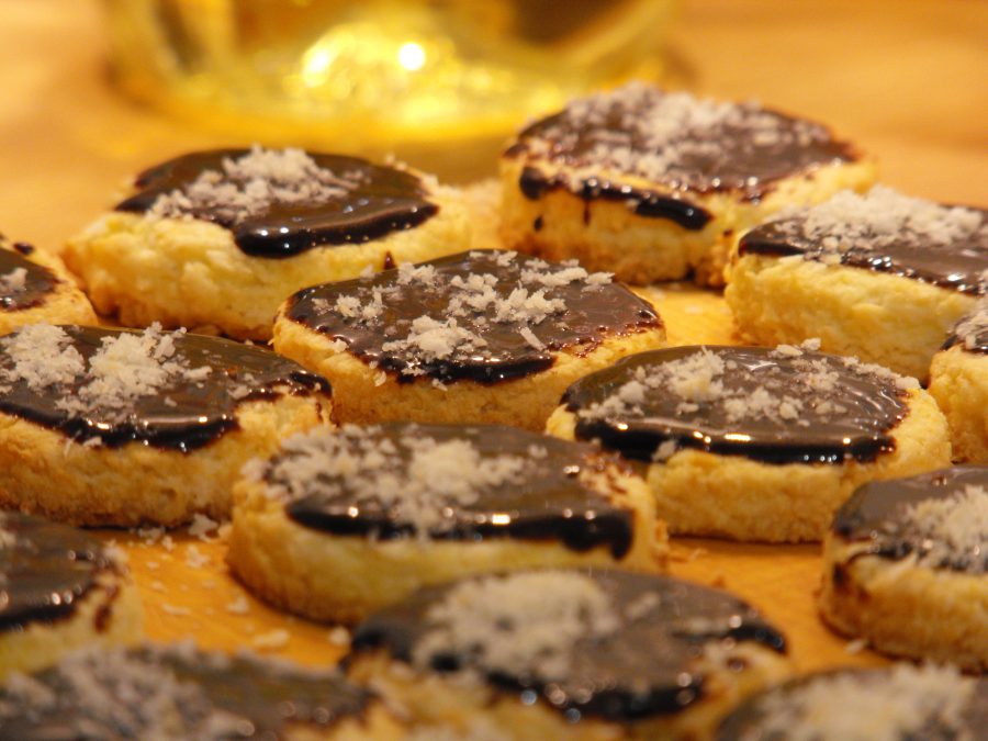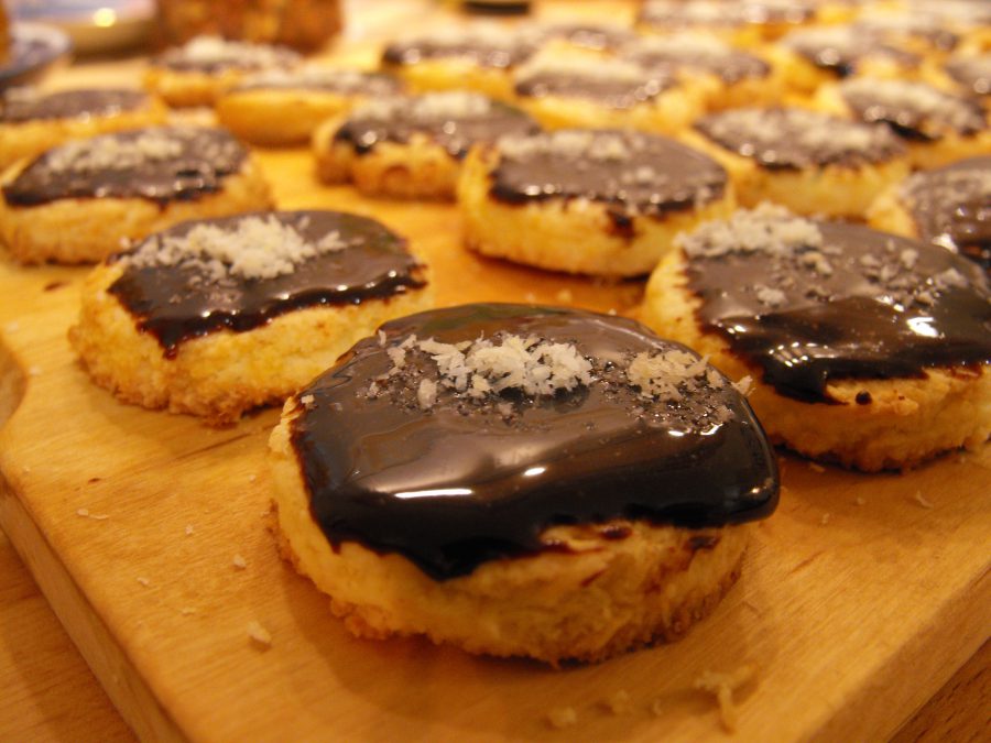 A félretett kókuszreszeléket serpenyőben egy picit megpirítottam. A kihűlt tallérok tetejét megkentem a csokimázzal, és megszórtam a pirított kókusszal (így folyékonyan egyébként még fényes volt a csoki, ahogy a képeken is látszik). Hűtőbe tettem, hogy hamarabb megdermedjen a máz, később viszont fémdobozban érdemes tárolni.