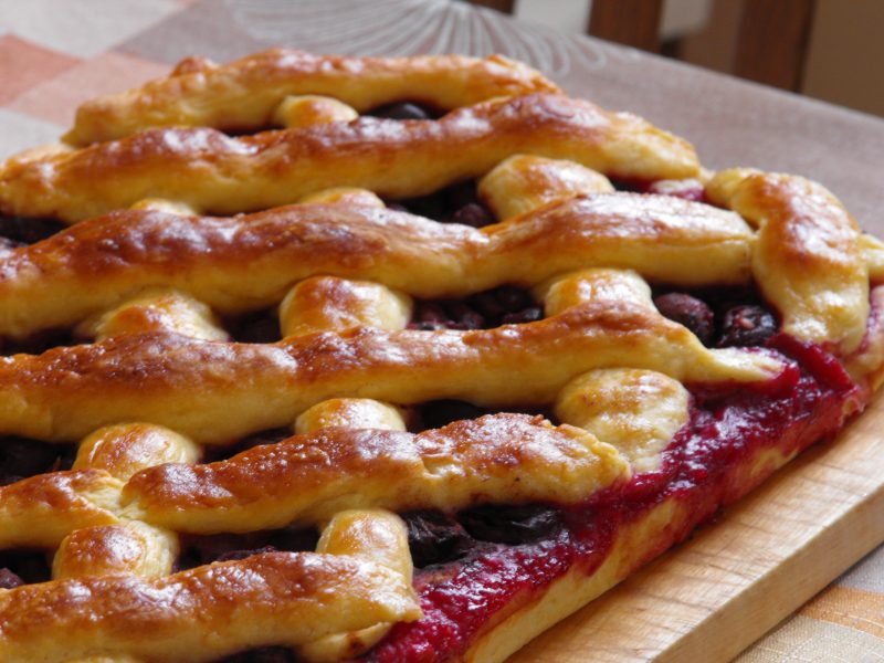 Sokszor elkészítettem már ezt a meggyes-rácsos süteményt – amióta először kipróbáltam, ez a kedvenc pite-tésztám. Érdekes keveréke a linzer- és a kelttésztának: az omlós tésztához hasonló arányban kerülnek bele az alapanyagok, de élesztő is van benne. Dagasztás helyett viszont csak gyúrni kell, majd meleg helyen keleszteni. A sima keksz-szerű tésztáknál levegősebb, kevésbé száraz alapot kapunk így, amit lehet meggyen kívül almával vagy túróval is tölteni.