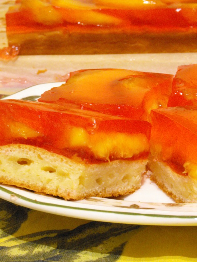 Az elkészült tortazselét a tésztára öntöttem, majd kiraktam a tetejét a barackkal. Ezután elkészítettem a másik két csomag zselét, és egyenletesen bevontam vele a sütit. Hűtőbe raktam, és amikor kihűlt a teteje, kis kockákra vágva tálaltam.
