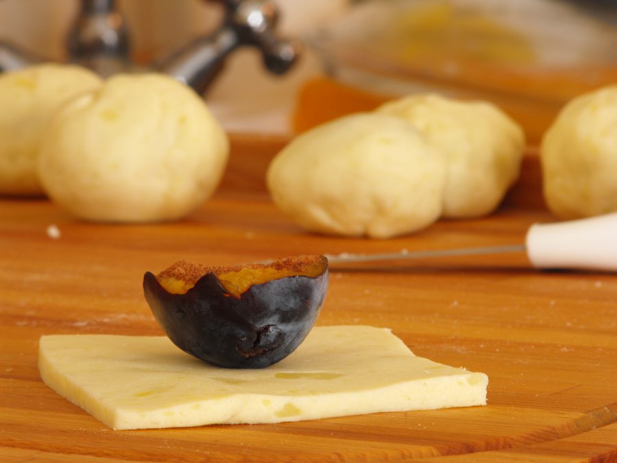 Ezután akkora négyzetekre vágtam a tésztát, hogy a felezett szilvákat szépen bele lehessen csomagolni. A négyzet sarkait ráhajtottam a szilvára, majd összenyomkodtam, és óvatosan átgyúrtam, hogy főzés közben ne essen szét.
