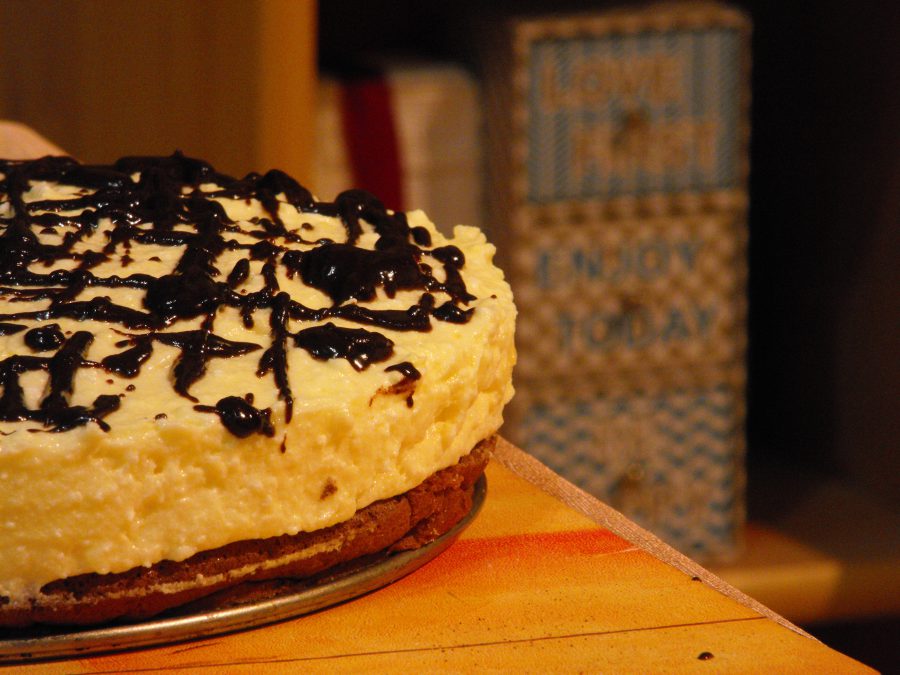 Végül a csokit alacsony hőfokon felolvasztottam, egy kevés olajat is adtam hozzá hogy fényesebb és hígabb legyen. Egy evőkanál segítségével keresztbe-hosszába, egyenetlen csíkokban rácsorgattam a torta tetejére, mintha csak összefröcsköltem volna 🙂