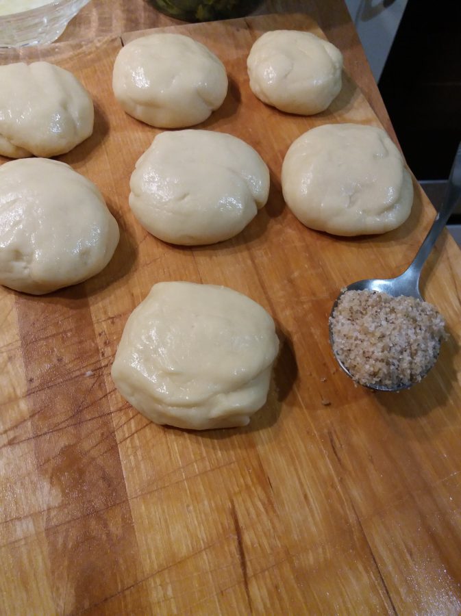 A tésztához az élesztőt egy kevés langyos-mézes tejben felfuttattam. Használhatunk friss élesztőt is – kb. 2 dkg-ra lesz szükség belőle. A lisztet egy nagy tálba szórtam, hozzáadtam a tej többi részét, a tojássárgáját, a xilitet, az olvasztott vajat. Amikor az élesztő feljött, azt is beleöntöttem, majd egy kevés citromlével és rumaromával ízesítettem. Az egészet dagasztókarral alaposan összegyúrtam. Szép, lágy tészta lesz belőle, alig sűrűbb, mit egy galuska – de nem szabad több lisztet hozzátenni, mert száraz lesz! Kelesztés után lehet majd dolgozni vele. Addig gyúrtam, míg egy picit kezdett elválni a tál oldalától. Azután letakarva meleg helyre tettem és majdnem egy órát kelesztettem.
