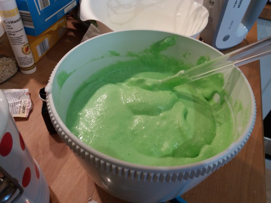 A zöld piskótához a tojásokat szétválasztottam, a fehérjét habbá vertem, a sárgáját kikevertem a xilittel. Ekkor került bele az ételfesték: én folyékonyat használtam, ebből 2-3 teáskanál elég ahhoz, hogy szép élénkzöld színt kapjon a tészta. Hozzákevertem a lisztet, sütőport. A tojáshab egy részét még géppel kevertem bele, a többit óvatosan spatulával beleforgattam. Így nézett ki a zöld piskótatészta: