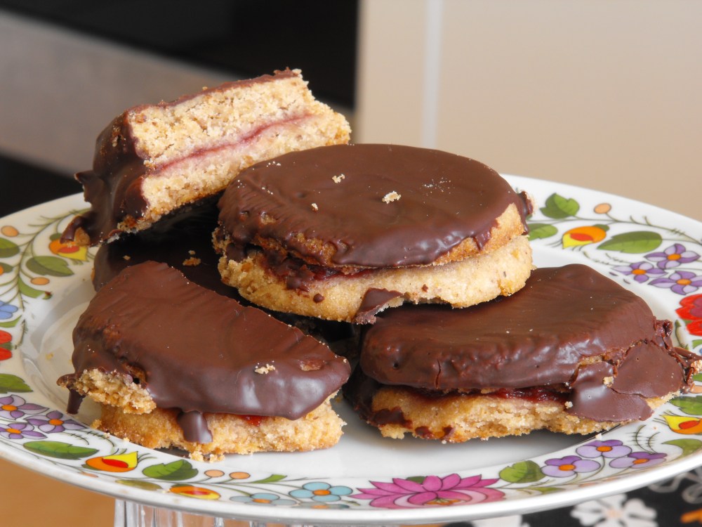 A sütőből kivéve hagytam hűlni, mert melegen még nagyon törékeny, szétesős volt a tészta. Amikor viszont kihűlt, akkor már szépen össze lehetett ragasztani kettőt-kettőt a lekvárral. Pici száradás után pedig a felolvasztott tortabevonóval megkentem a tetejét, és amennyire tudtam az oldalát is. Hát, ezen a részen még lehetne finomítani, hogy szép egyenletes legyen a bevonat, de szerencsére ez az ízeken nem változtatott 🙂 A kész islereket hűtőbe raktam, hogy a máz megszilárduljon rajta, majd lehetett is kóstolni!