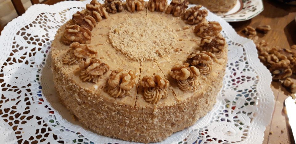 A torta tetején bejelöltem a 16 szeletet. A maradék krémet habzsákba töltöttem, és mindegyik szeletnek a szélére, körbe egy kis kupacot nyomtam. A 16 szem szép, egészséges dióval feldíszítettem a szeleteket, végül a torta közepére is szórtam még egy kis darált diót (egy kerek pogácsaszaggatót raktam rá, abba szórtam, hogy szabályos kör legyen)