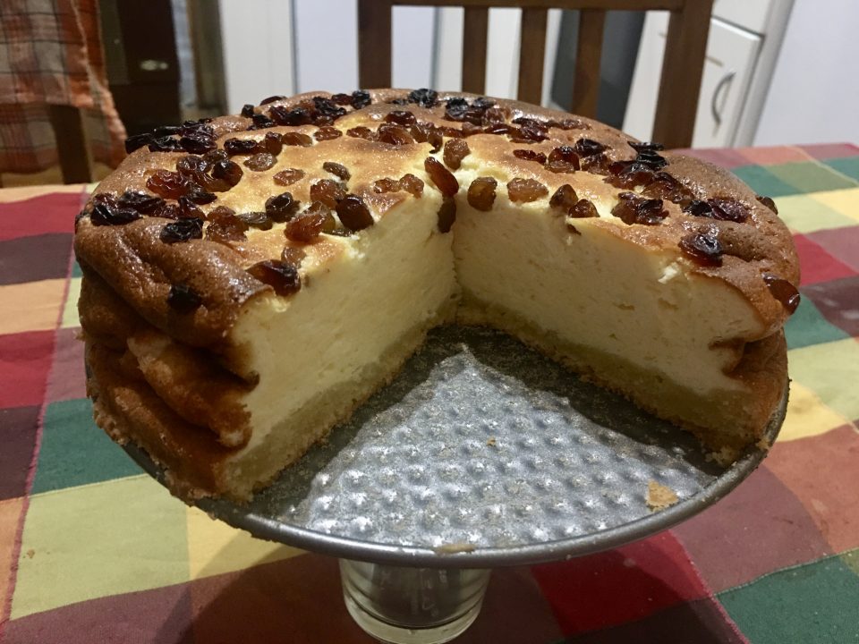 Vajjal alaposan kikenjük és pici rizsliszttel megszórjuk a tepsit. A tésztát egyenletesen belesimítjuk-lapítgatjuk az aljába, majd ráöntjük a krémet. A tetjére szórhatunk mazsolát – de aki nem szeretni, nyugodtan kihagyhatja.