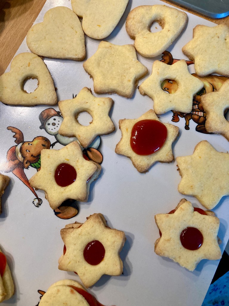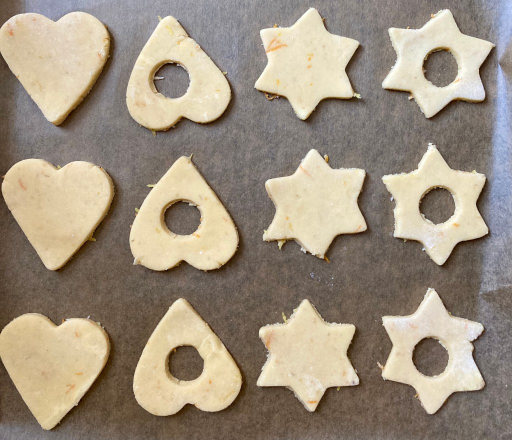 A kinyújtott tésztát kiszaggatjuk – nekem linzer formám nem volt itthon, ezért csillagok és szívek készültek ⭐️ 💛 Minden másodiknak a közepére egy kis karikával lyukat szúrunk (én ehhez egy habzsákhoz való kis fém nyomófejet használtam, de bármi megfelel, ami megfelelő nagyságú kerek formát tud kiszúrni 🙃 )