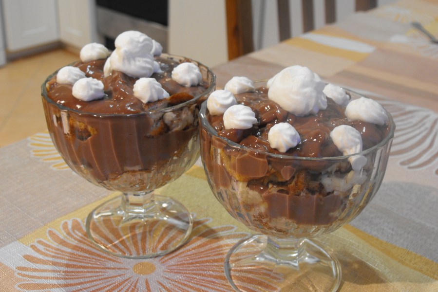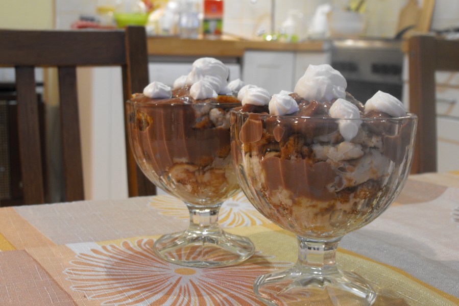 Na de azért kárba veszni nem hagytuk: “ha már szakad, hadd szakadjon” jelszóval kisebb darabokra tépkedtem a palacsintákat (amelyik véletlen egybe maradt, azt is), üveg fagyis kehelybe tettem, és rákanalaztam egy adag pudingot. Majd még egy réteg palacsinta következett, a tetejére ismét puding. Végül egy kis tejszínhabbal díszítettem.
