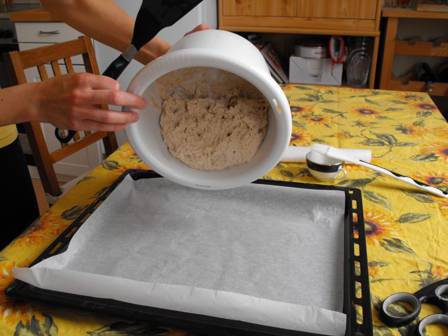 A lisztet egy nagyobb tálba szórtam, és hozzákevertem az élesztőt, a sót és a cukrot. A vízbe belekevertem a tojást és az olajat. Ezt a folyadékot a liszthez töltöttem, és a robotgép dagasztó spiráljával pár perc alatt szép simára-hólyagosra dagasztottam a tésztát. Letakartam, és meleg helyen kelesztettem kb. fél órát. Közben a nagy, lapos tepsit kibéleltem sütőpapírral, a papírt pedig megkentem egy kevés olajjal. A sütőt előmelegítettem 200 fokra.