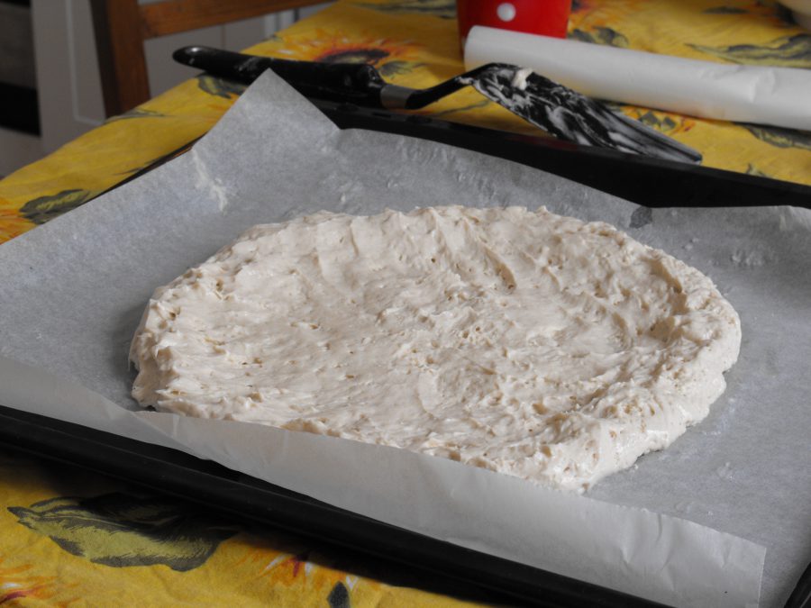 Szépen megkelt a tészta, lágy állagú lett, nem az a gyúrható-nyújtható fajta kelt tészta. Ráborítottam a tespire, egy vizes spatula segítségével kikanalaztam a tálból. Vizes kézzel köralakúra formáztam és elsimítgattam. Mivel mi a vastag tésztás pizzát szeretjük, így az egész adagból egy kb. 26 cm átmérőjű pizza lett; ha vékony tésztásat szerenénk készíteni, akkor két ekkora kör jön ki belőle.