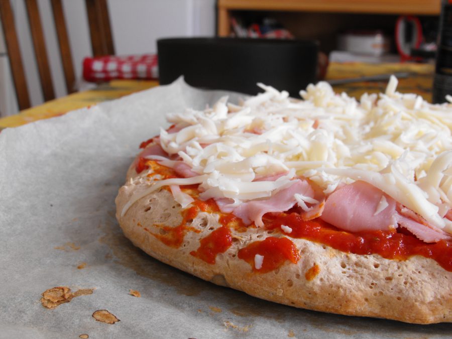 Az elősütött pizzalapot megkentem pizzaszósszal, és jól megpakoltam sonkával és sajttal. Természetesen bármilyen tetszőleges feltéttel készíthető – mi most ezt az egyszerű verziót választottuk, amihez éppen volt itthon minden 🙂