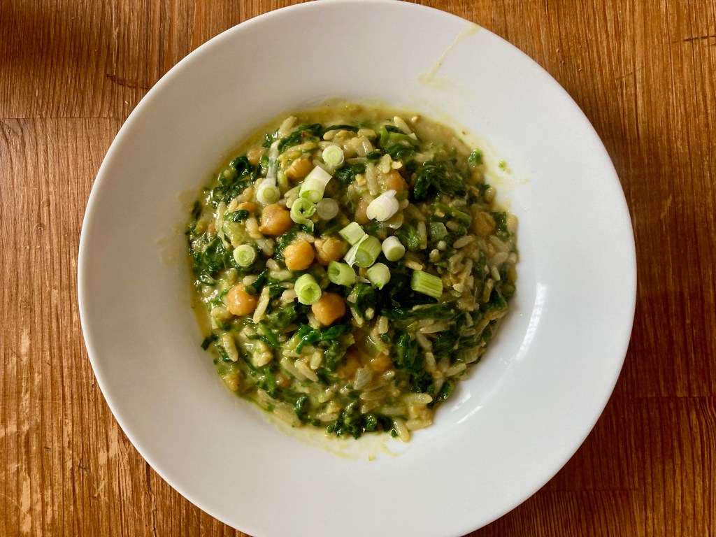Amikor a csicseriborsó megpuhult, leszűrjük, és a spenóthoz adjuk. Felöntjük a zabtejszínnel – vagy más vegán főzőtejszínnel. Végül hozzákeverjük a megfőtt barnarizst is, az egészet még egyszer átforraljuk, ha kell, ízesítjük – ki mennyire csípősen szereti.