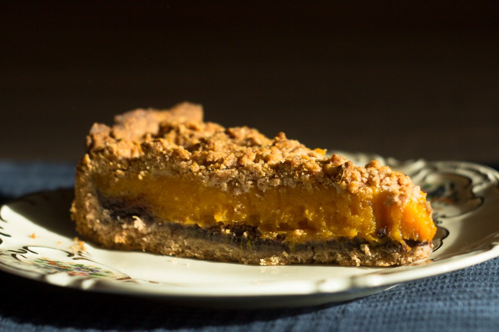 Kend meg a kicsit vizezett lekvárral a tésztát. Erre szórhatod, ha gondolod, a darált kekszet. Erre pakold föl az összeturmixolt sütőtökkrémet.